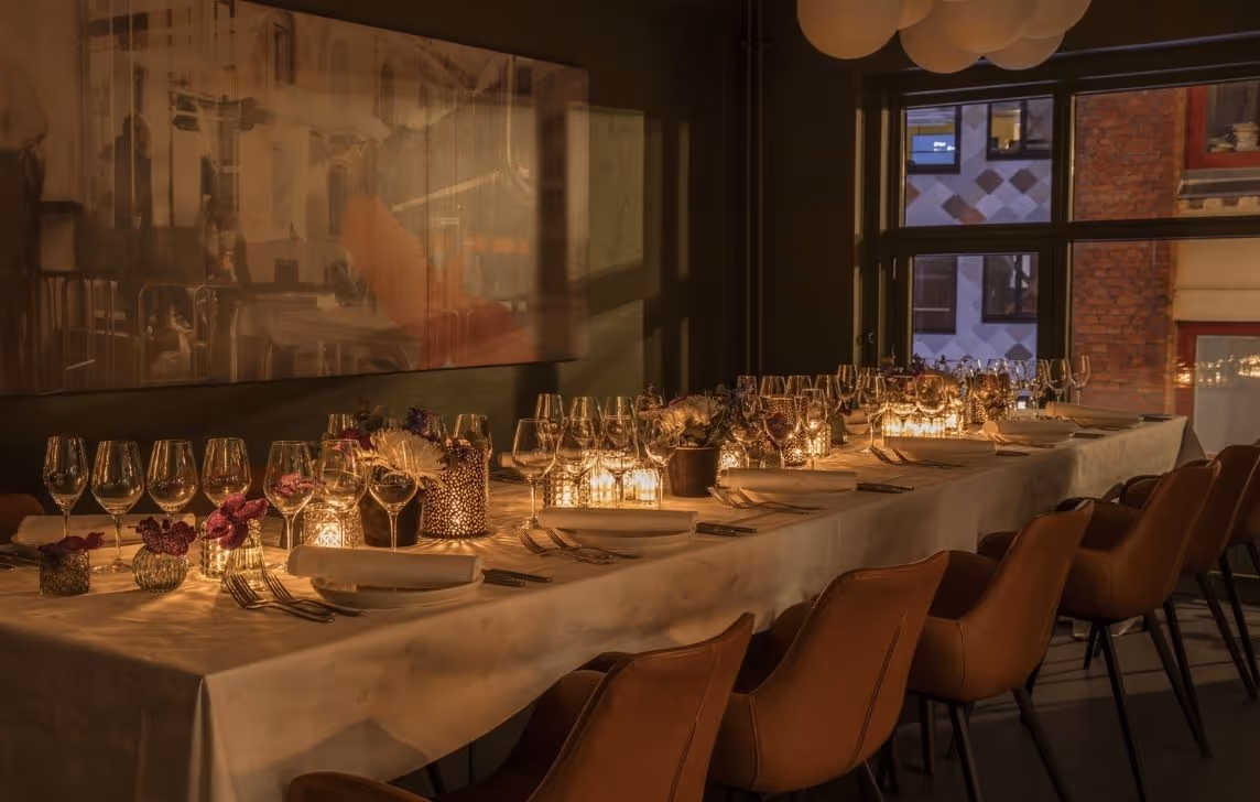 Elegant lokale med høyt under taket, store vinduer og stilren atmosfære. Perfekt for julebord, bryllup og formelle middager – midt i hjertet av Oslo.