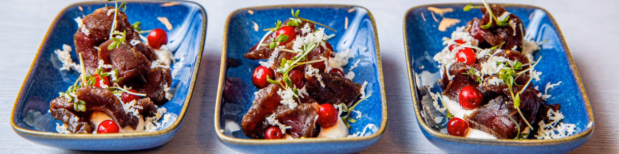 Fingermat fra RealMat passer perfekt når du vil skape en sosial og avslappet atmosfære – enten det er firmafest, lansering, bryllup eller bursdag. Våre menyer er fulle av små, smakfulle biter som kombinerer det enkle og elegante med ekte smak og råvarer vi er stolte av. Vi tilbyr både kalde og varme varianter – fra små sliders og wraps til ceviche, tartar og sprø grønnsaker med dip. Alt er håndlaget og delikat anrettet, slik at det er lett å spise stående og perfekt for mingling. Fingermaten kan tilpasses både sesong, tema og preferanser – og vi har alltid vegetariske og allergivennlige alternativer klare. Server gjerne i ett av våre lokaler som RoofGarden eller Tivander – eller få det levert som catering der du ønsker.