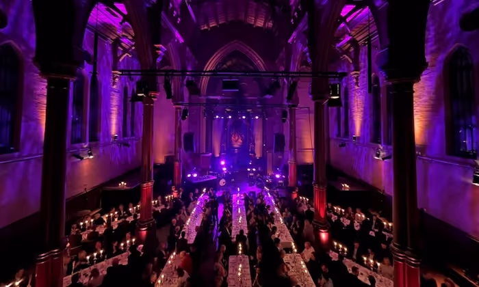 Etter middagen kan kirkerommet gjøres om til en spektakulær festarena. De mektige kirkesøylene blir kulisser for et lysshow, det historiske orgelgalleriet vibrerer av musikken, og gjestene slipper seg løs på dansegulvet! Enten du foretrekker en livlig dans med kollegaer og venner eller en rolig prat i et av de lune hjørnene eller ute i hagen, er denne festen skapt for å glede absolutt alle.